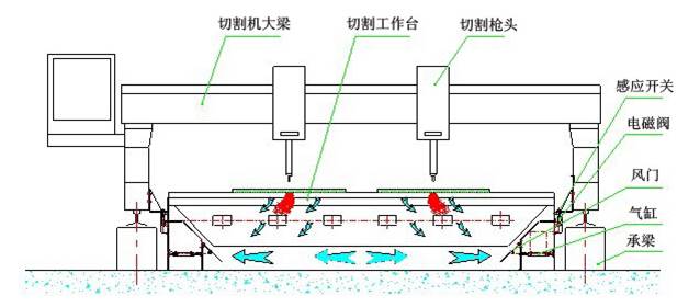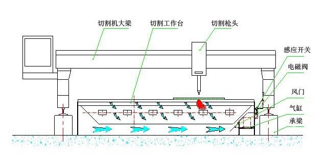 下吸式煙塵凈化系統(tǒng)抽風(fēng)是通過(guò)下吸式抽風(fēng)切割臺(tái)來(lái)實(shí)現(xiàn)的,下吸式抽風(fēng)切割臺(tái)分成若干個(gè)區(qū)域,每個(gè)區(qū)域設(shè)計(jì)有風(fēng)門吸風(fēng),切割槍頭在每個(gè)區(qū)域切割時(shí),相應(yīng)區(qū)域的風(fēng)門打開抽風(fēng),將切割機(jī)的粉塵吸除。