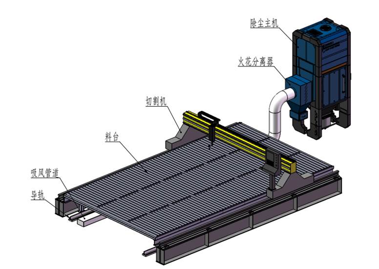 側(cè)吸式煙塵凈化系統(tǒng)采用吸風(fēng)口固定在切割機(jī)龍門架上,吸風(fēng)口與吸風(fēng)道之間通過(guò)密封皮帶密封,吸風(fēng)口可隨龍門架在吸風(fēng)道上來(lái)回移動(dòng)吸風(fēng),將切割的粉塵吸除。