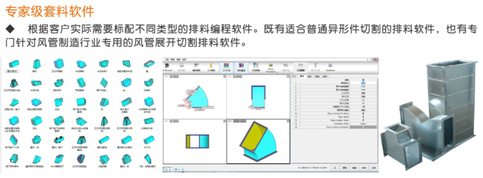 各種工業(yè)異形件加工;各種通風管道彎頭切割加工(配合專用的風管選型與編程軟件,輕松實現(xiàn)風管切割加工),各種薄板金屬制品的切割加工(如:不銹鋼廚具、炊具),廣泛應(yīng)用于各個行業(yè)的金屬薄板切割加工。